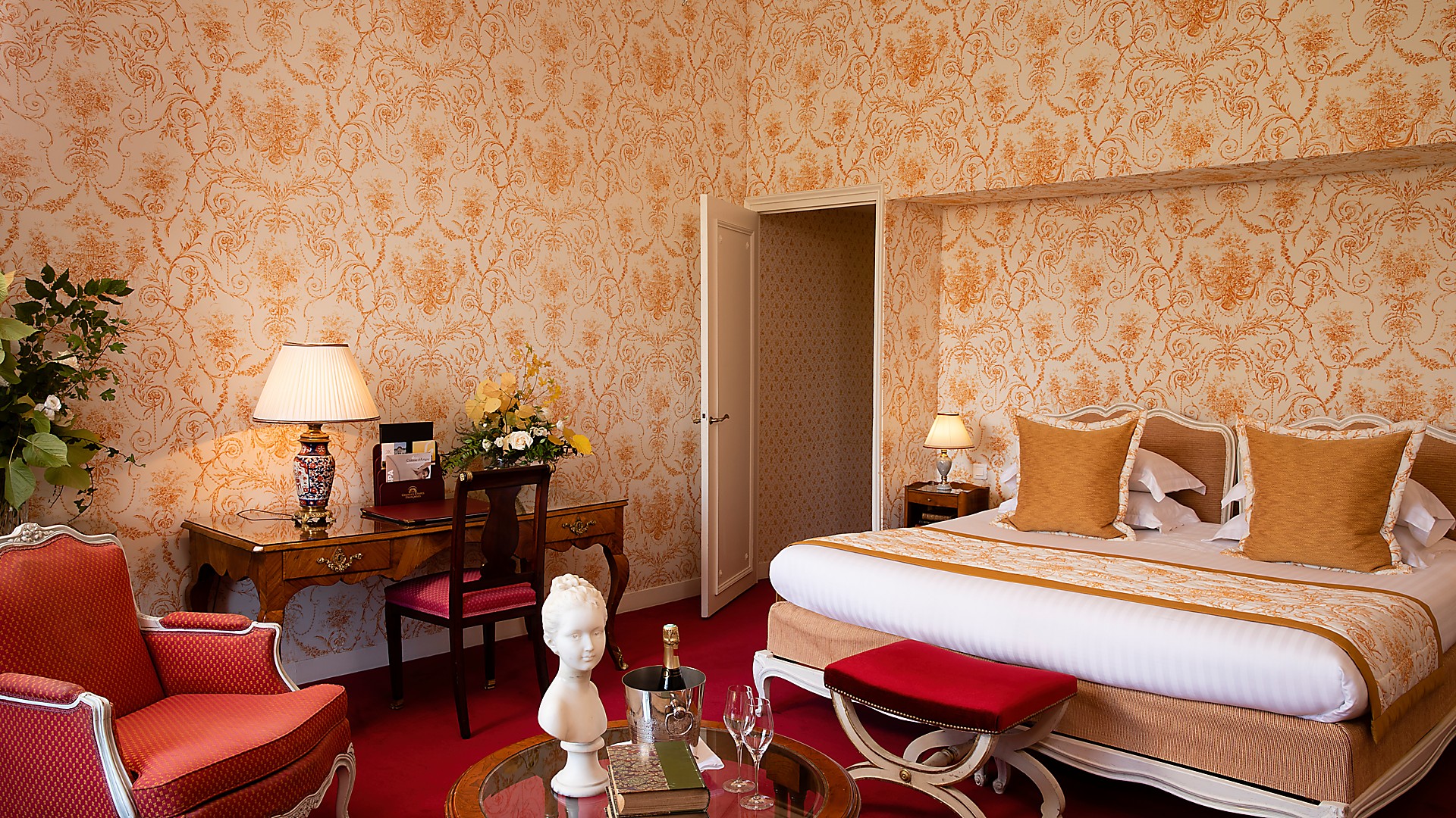 Step inside to discover sumptuous rooms and suites, adorned with frescoed ceilings, antique furnishings, and classic French detailing. The atmosphere evokes a golden era of refinement, where art, beauty, and hospitality intertwine effortlessly.